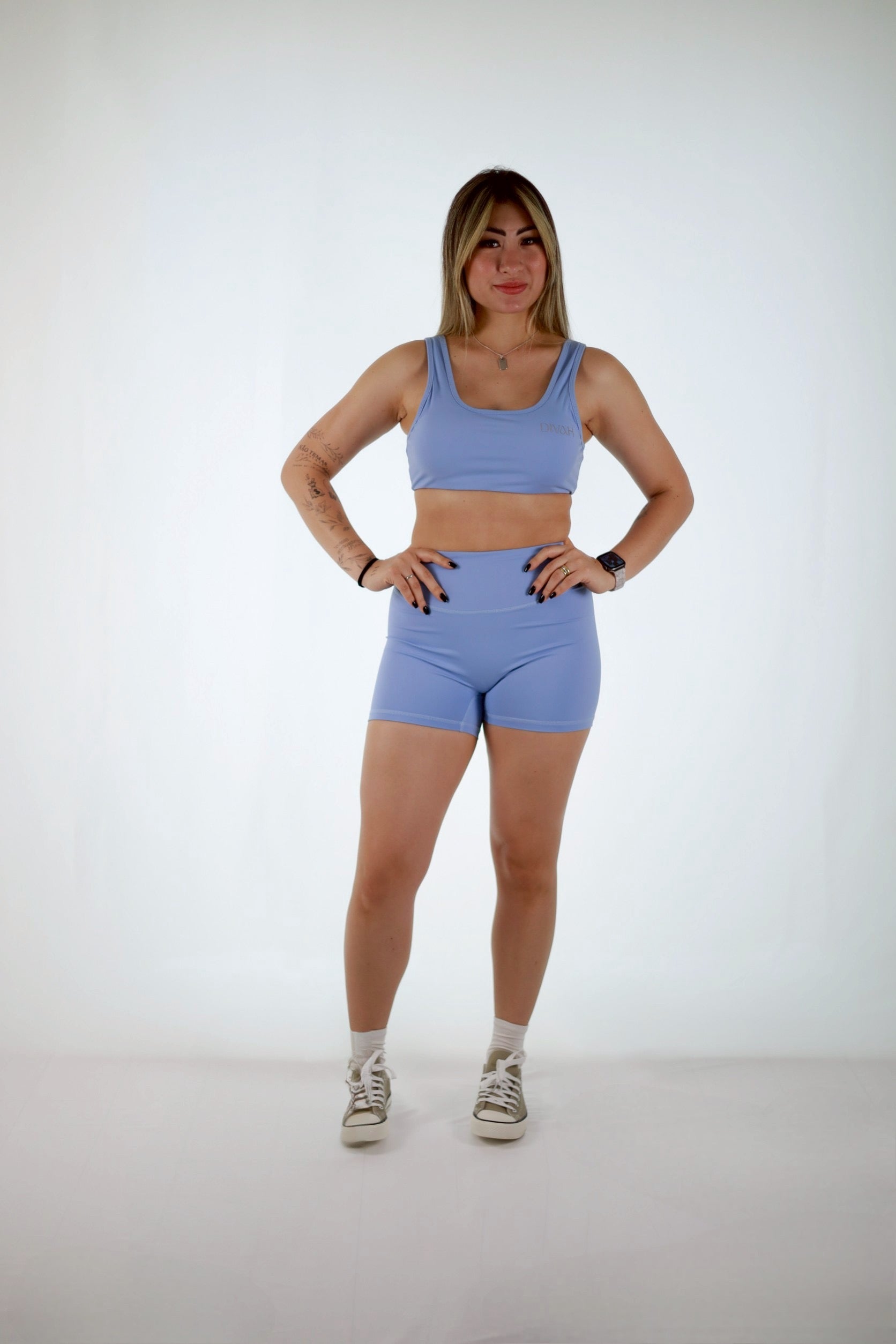 Com top reto e short liso, ele tem uma modelagem que se adapta ao corpo, valorizando a silhueta de forma sutil e elegante.